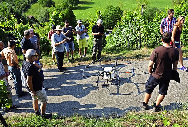 Mit dem Einsatz einer Sprühdrohne können steile Rebberge auch nach Niederschlägen problemlos beflogen werden, während der Einsatz eines Traktors noch heikel wäre. Weitere Vorteile einer Sprühdrohne: Das Spritzpersonal ist den Pflanzenschutzmitteln weniger ausgesetzt, keine Unfallgefahr für Personen, keine Bodenverdichtung, vergleichbare Wirksamkeit wie bei Gebläsesprühgeräten. Die Wirksamkeit der Applikation wurde in Tests während zwei Saisons dokumentiert.