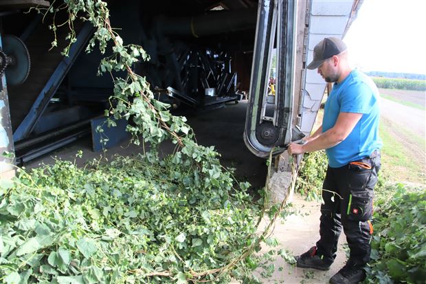 In der stationären Hopfenpflückstation in Unterstammheim herrscht in diesen Tagen reges Leben. Die geschnittenen Hopfenpflanzen mit den daran während des Sommers herangereiften Hopfendolden werden einzeln von Hand in ein Einzugsband eingeklinkt. Dieses zieht die ganze Staude in die Maschine, wo die einzelnen Hopfendolden maschinell von den Stauden gezupft werden.