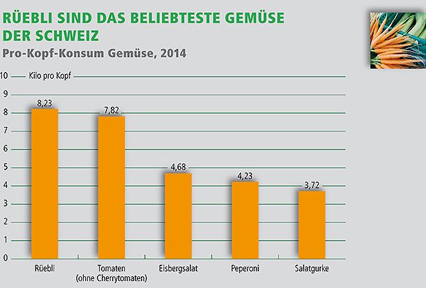 Der Pro-Kopf-Konsum von Karotten lag 2014 bei 8,23 Kilo. Damit konnte das Rüebli seinen Spitzenrang aus dem Vorjahr verteidigen.