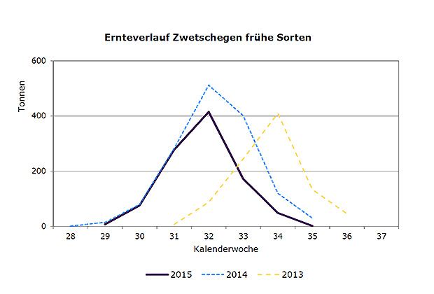 Gemäss Mitteilung des Obstverbandes dürften bis Mitte August rund 1000 Tonnen gepflückt werden. Das entspricht einer durchschnittlichen bis guten Erne. Haupternte der frühen Sorten (Tegera und Cacaks Schöne) ist von Ende Juli bis Anfang August. Die Hauptsorte der späten Ernte ist die Fellenberg. Eine Ernteschätzung wird Ende Juli vorgenommen.