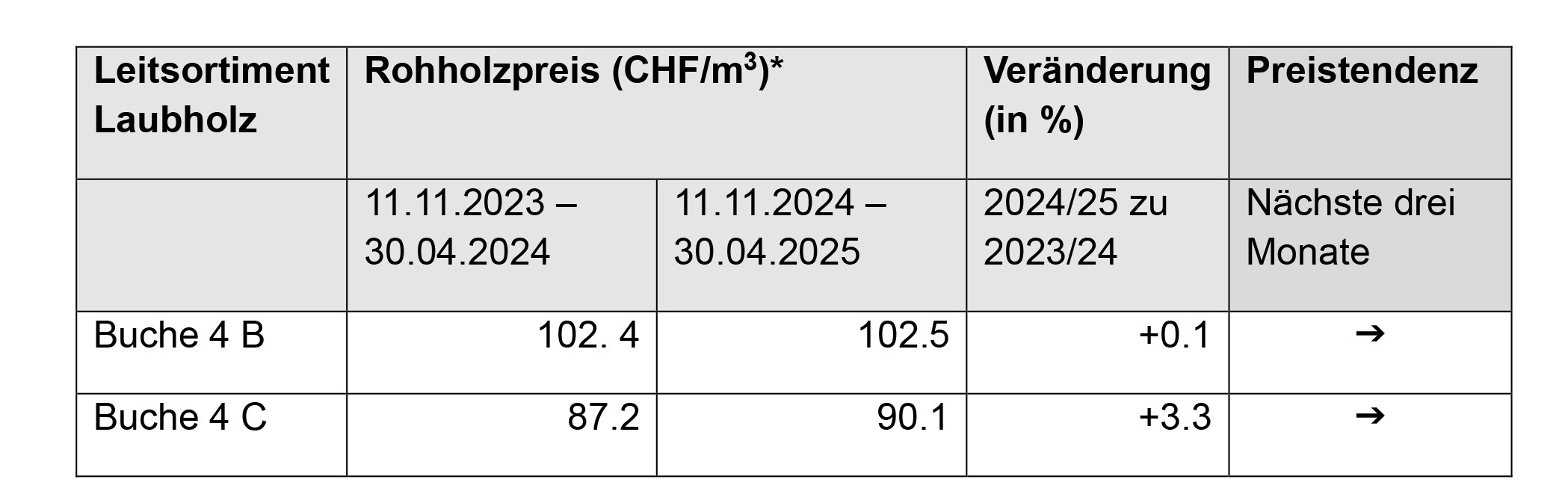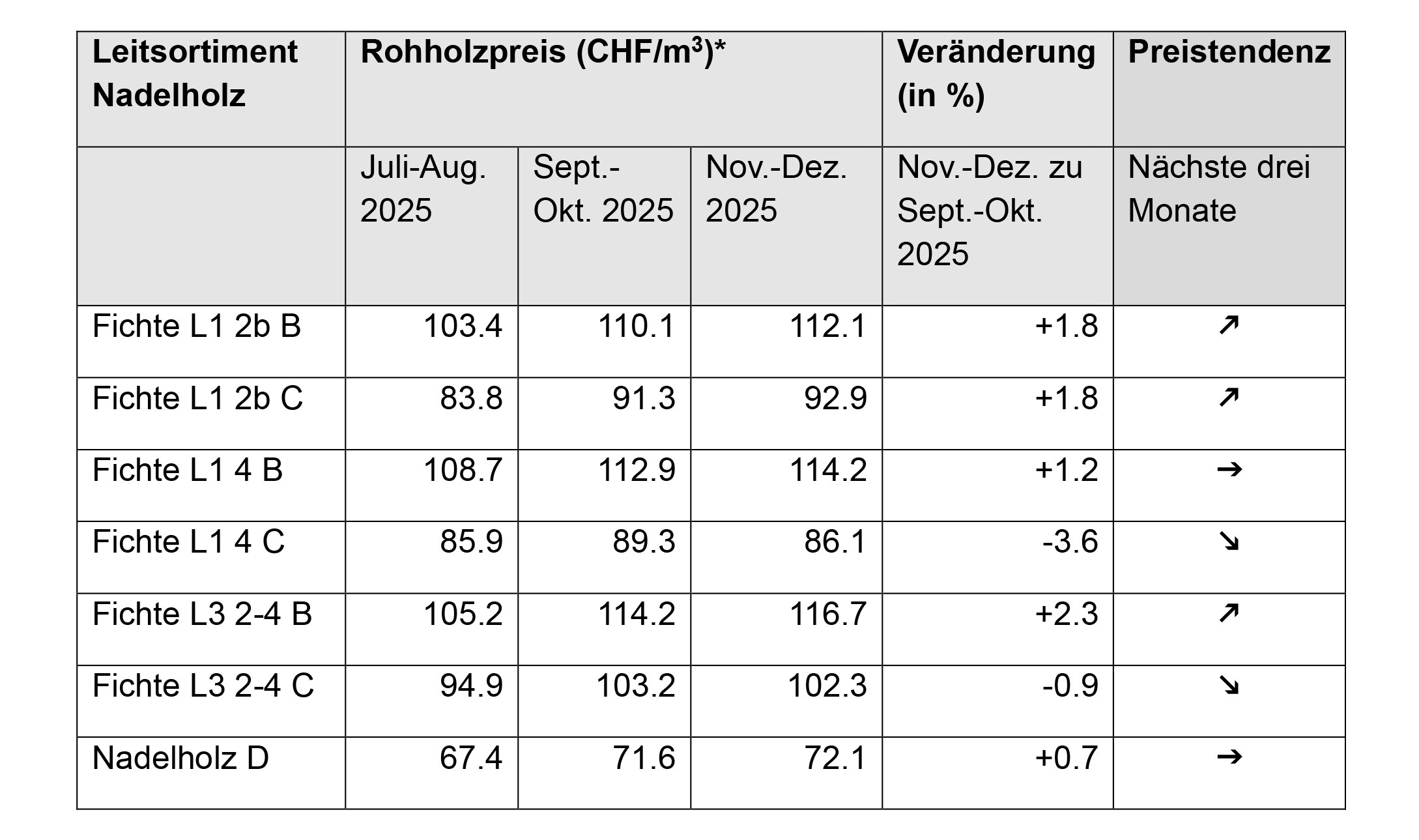 Die Preisangaben beruhen auf der zweimonatlichen Erhebung für Nadelholz resp. einmal jährlichen Erhebung für Laubholz durch den statistischen Dienst des Schweizer Bauernverbandes Agristat im Auftrag von WaldSchweiz. Bei der Rohholzpreiserhebung handelt es sich um mengengewichtete Durchschnittspreise. Die am Markt umgesetzten Preise können regional, saisonal und je nach Verwertungspfad stark vom aufgeführten Mittelwert abweichen.