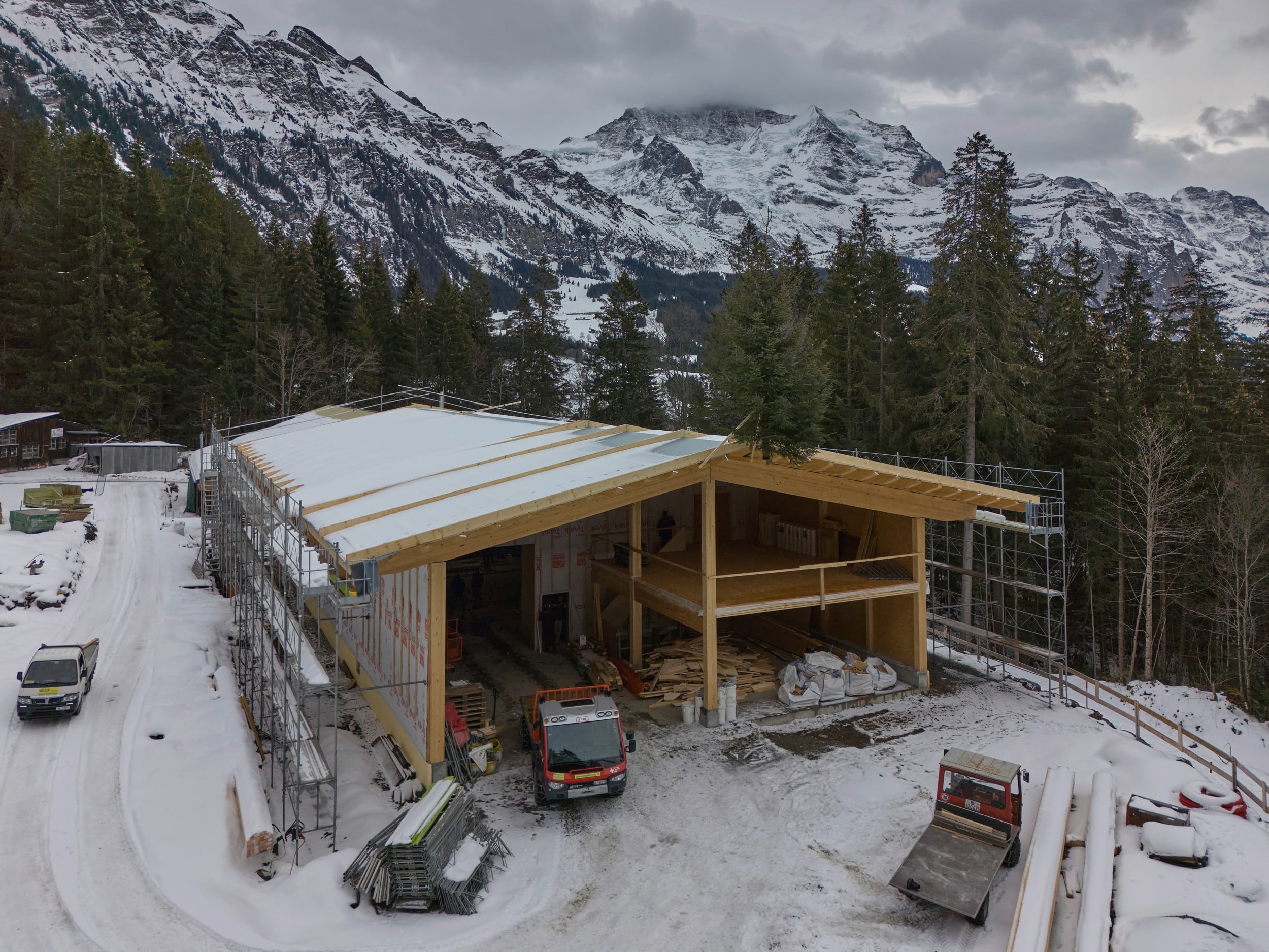 Holzbau mit Logistik im Blut bei Müller Holzbau in Wengen im Kanton Bern: Müller Holzbau zeigt, was «Bauen im Berggebiet» praktisch bedeutet – Material kommt entweder per Bahn, oft auch per Helikopter. Bauen wird dadurch rund ein Viertel teurer als im Tal unten. Die Werkhalle ist darum nicht einfach eine schöne Investition, sondern eine Voraussetzung, um effizient zu bleiben und Ausbildungsplätze zu sichern.