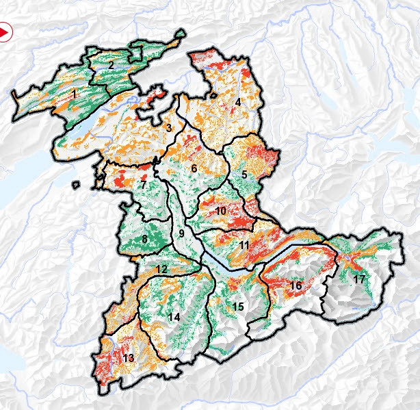 Mithilfe dieser Karte lässt sich erkennen, wo die Verjüngungsziele im Jahr 2025 erreicht werden können (tragbar, grün), wo sie unsicher sind (kritisch, gelb) und wo sie nicht erreicht werden können (untragbar, rot).