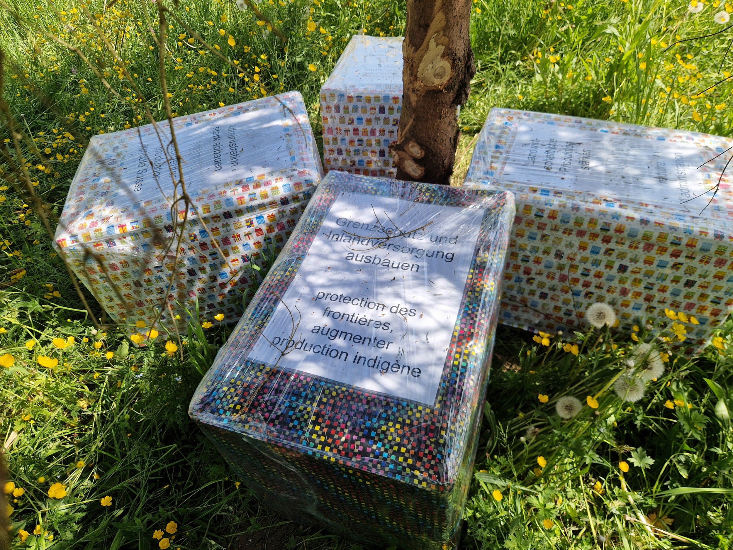 Auf den vier Geschenken unter dem Maitannli steht jeweils eine Forderung der bäuerlichen Basisbewegung. Hier: Grenzschutz und Inlandversorgung ausbauen.