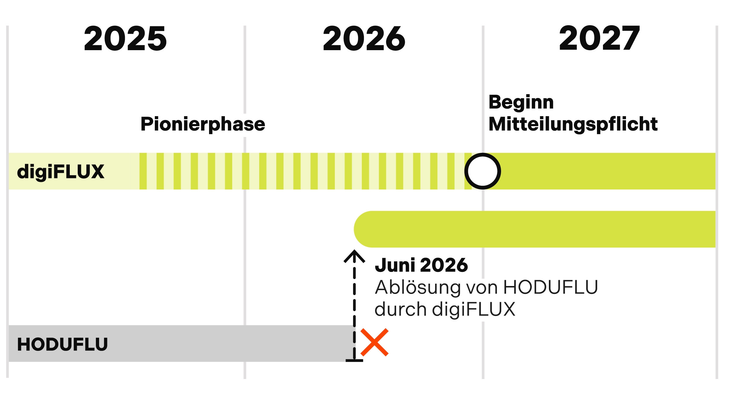 Ab 2027 erfassen alle, die mit Pflanzenschutzmitteln und Nährstoffen handeln, ihre Lieferungen auf Digiflux. Ebenfalls ab diesem Zeitpunkt können die Empfängerinnen und Empfänger diese Lieferungen digital bestätigen. Für den Bereich Hof- und Recyclingdünger ersetzt Digiflux ab Juni 2026 das bisherige Programm Hoduflu.