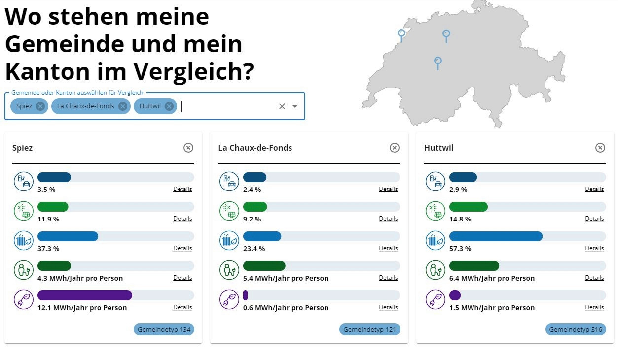 Auf der website der Energie Reporter können Gemeinden verglichen werden, wie sie in Sachen erneuerbare Energie aufgestellt sind.