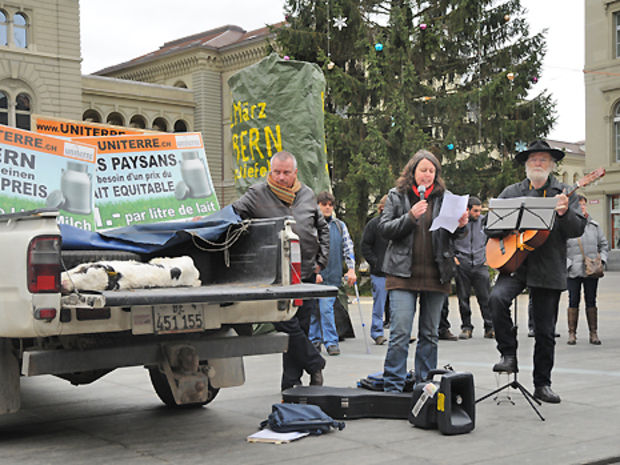 Die Bauern-gewerkschaft Uniterre hat am Freitag-morgen auf dem Berner Bundesplatz eine Aktion gegen die Industria-lisierung der Landwirtschaft und für höhere Milchpreise durchgeführt. Dabei präsentierten die Bauern auf der Ladefläche eines Pickups ein totes Kalb.