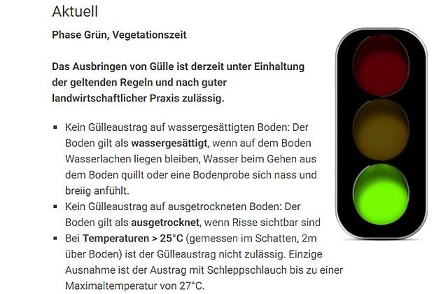 Unter www.ai.ch/duengen informiert der Kanton mit einem Ampelsystem über die aktuelle Situation. Während der Vegetationszeit gilt Phase Grün – das ist aktuell der Fall. In dieser ist Güllen unter Einhaltung der geltenden Regeln möglich. In der Übergangszeit gilt Phase Orange. In dieser publiziert der Kanton spezielle Hinweise oder Teilfreigaben fürs Güllen. In Phase Rot, die während der Vegetationsruhe im Winter gilt, ist Güllen verboten.