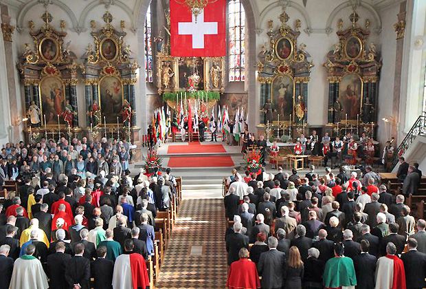 Hunderte von Einheimischen verfolgten den Festumzug mit Musik und Fahnen durch das Dorf Appenzell zur Kirche St. Mauritius. Dort würdigte Festredner Peter von Matt die Jubilare. Der Germanist und Schriftsteller erinnerte an die Landteilung von 1597.