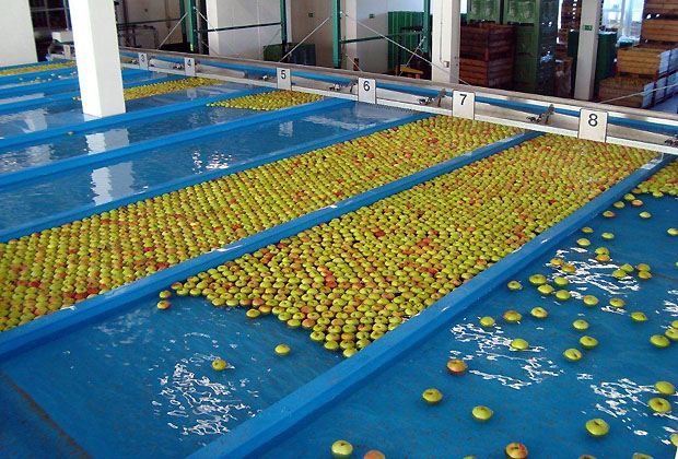 All dies wird in einem Raum überprüft, der auf den ersten Blick aussieht wie eine Abfüllhalle eines Getränke-Herstellers. Ein Roboter packt die grünen Harassen und manövriert die Äpfel in einen mit Wasser gefüllten Kanal. Das garantiert einen schonenden Transport. Danach sortiert eine Maschine die Früchte nach Farbe und Kaliber. Hier wird bestimmt, welche Äpfel dereinst als Klasse 1 im Laden landen, welche als Kochobst verkauft werden und welche als Ausschuss zu Most verarbeitet werden.