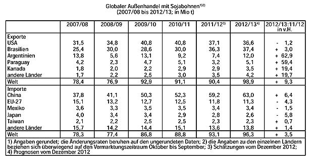 Das globale Sojabohnenaufkommen 2012/13 veranschlagt das USDA jetzt auf knapp 268 Mio. t. Das wären rund 28 Mio. t oder 12%mehr als 2011/12. Eigenen statistischen Auswertungen zufolge wichen die Dezember- Vorhersagen des USDA imMittel der vergangenen 30 Jahre um 5,4 Mio. t von der jeweils letzten Schätzung ab.