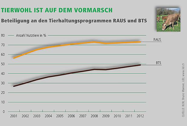 Der Anteil Tiere, die im Rahmen des staatlichen Programms "Regelmässiger Auslauf von Nutztieren im Freien" (RAUS) gehalten werden, stieg in den letzten zehn Jahren um 20 auf 73 Prozent. Beim Programm "Besonders tierfreundliche Stallhaltungssysteme" (BTS) verdoppelte sich der Anteil auf heute knapp 50 Prozent (siehe Grafik). Dazu kommen diverse Labels, deren Anforderungen über die minimalen gesetzlichen Vorschriften hinausgehen.
