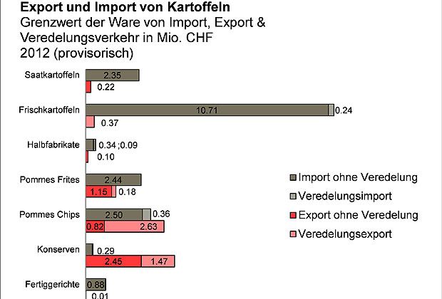 Die Exporte von Kartoffelprodukten stabilisierten sich mengen- und umsatzmässig auf dem vorjährigen Niveau. Jedoch sind rückläufige Exportumsätze bei den Produkten Pommes Frites und Chips zu verzeichnen, welche durch steigende Umsätze bei den Konserven kompensiert wurden. Insgesamt wurden im Jahr 2012 mindestens 53.4% des gesamten Exportumsatzes durch den Veredelungsverkehr erzielt.