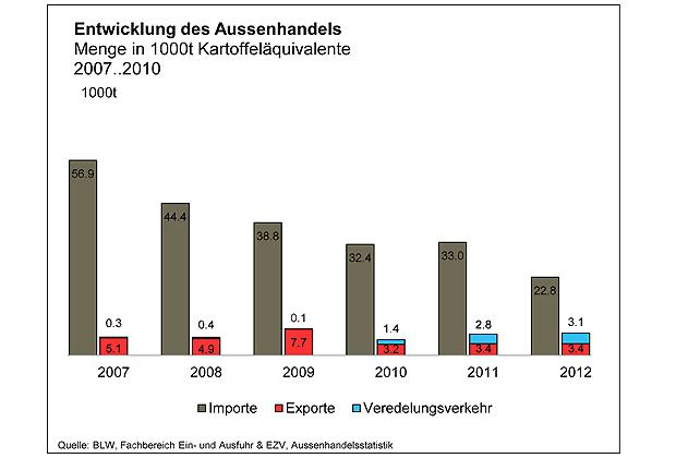 Die Importe haben 2012 erneut abgenommen (-31%), dies aufgrund einer rückläufigen Einfuhr von Veredelungskartoffeln (-94%). Der Rückgang sei auf die eher hohen und qualitativ guten Lagerbeständen zurückzuführen, schreibt das BLW. Stattdessen konnte Schweizer Ware veredelt und exportiert werden. Auch die Einfuhr von Speisekartoffeln ist weiter rückläufig. Im Jahr 2012 wurde eine Abnahme von 6% beobachtet.