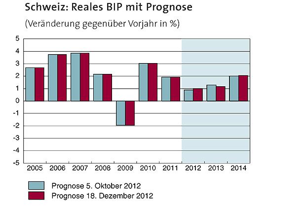 Die KOF-Forscher halten im wesentlichen an ihrer letzten Prognose vom September fest: Damals hatten sie für 2013 ein Wachstum des Bruttoinlandprodukts (BIP) von 1,3 Prozent prognostiziert. Bei der Arbeitslosigkeit gehen sie davon aus, dass die Quote von 2,9 Prozent in diesen Jahr auf 3,2 Prozent im nächsten Jahr steigt.