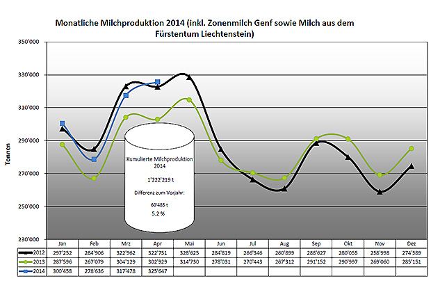 Die Milchproduktion belief sich im April 2014 auf 325‘647 Tonnen. Gegenüber dem gleichen Vorjahresmonat entspricht dies einem Plus von 7,5 Prozent.
