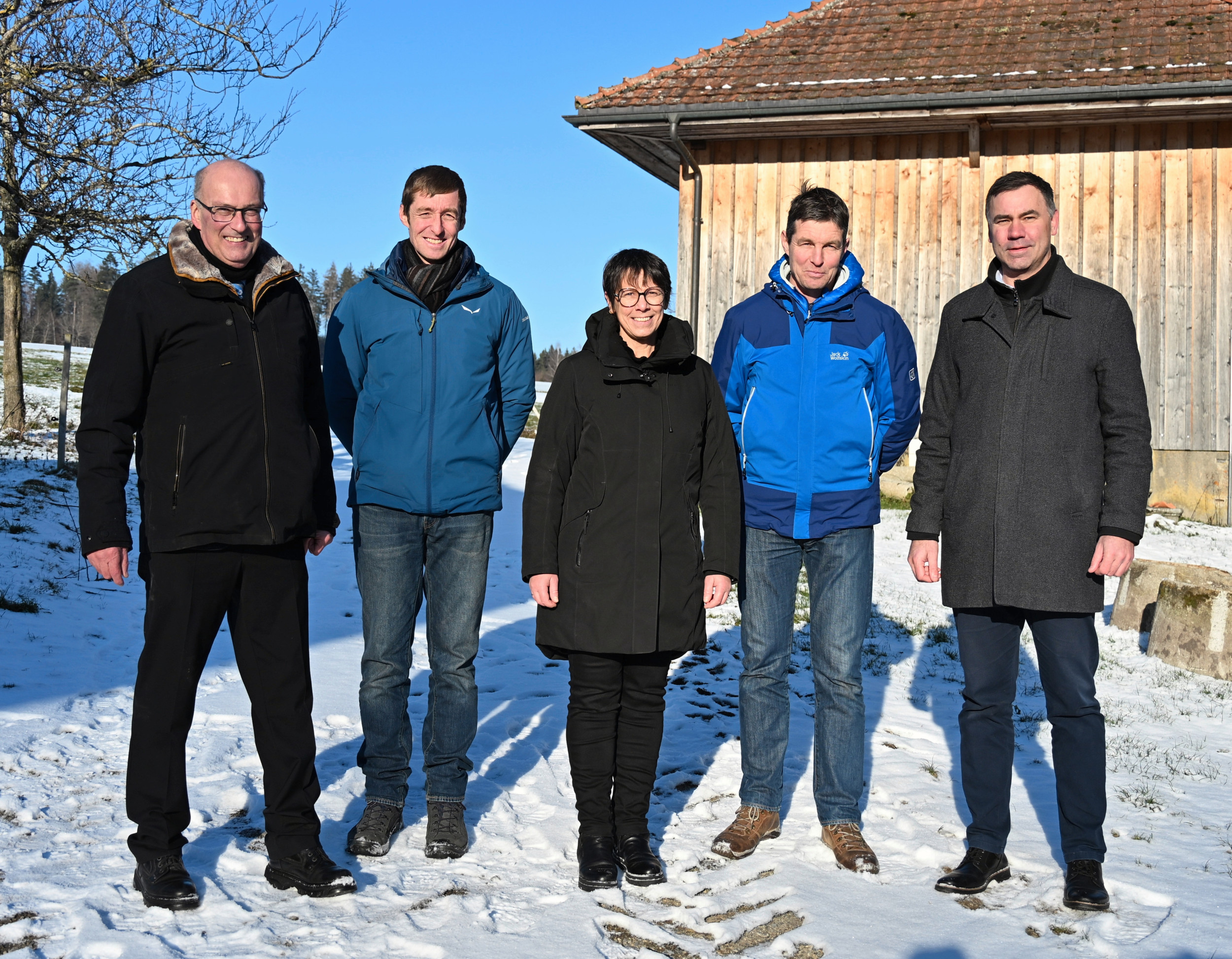 Von links nach rechts: SBV-Präsident Markus Ritter, Landwirt Daniel Etter, SBV-Vizepräsidentin Anne Challandes, Landwirt Christoph Etter und SBV-Direktor Martin Rufer.