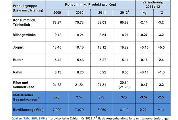 Insgesamt hat jede Schweizerin und jeder Schweizer im vergangenen Jahr 370 Kilo Milchprodukte konsumiert. Das sind 2,5 Prozent weniger als 2011. Das habe mit dem Lagerabbau zu tun, der im Jahr 2012 vorgenommen wurde, schreiben , der die Schweizer Milchproduzenten und weitere Organisationen im Marktlagebericht. Der Rückgang bei der Butter sei vollumfänglich auf den Industriebereich zurückzuführen. Im internationalen Kontext ist der Pro-Kopf-Konsum von Milch und Milchprodukten in der Schweiz unverändert sehr hoch, heisst es im Bericht.