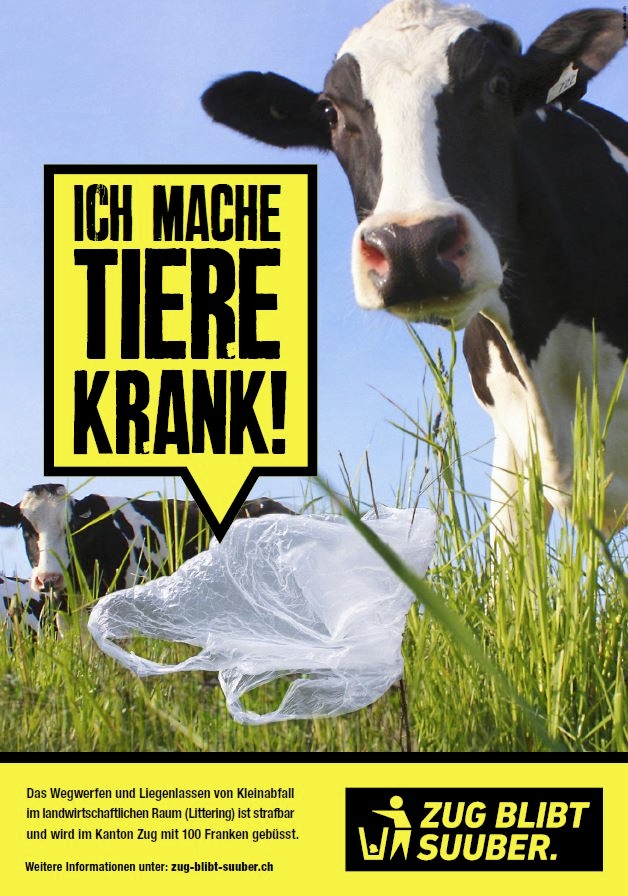 Immer wieder verletzten sich zum Beispiel Weidetiere und Wildtiere an Aluteilen von achtlos weggeworfenen Getränkedosen, die von der Mähmaschine verhäckselt würden und sich so mit dem Schnittgut vermischten, heisst es auf der Kampagnen-Website. Mit speziellen Sujets machen die 11 Zuger Gemeinden deshalb auf das Littering-Problem aufmerksam.