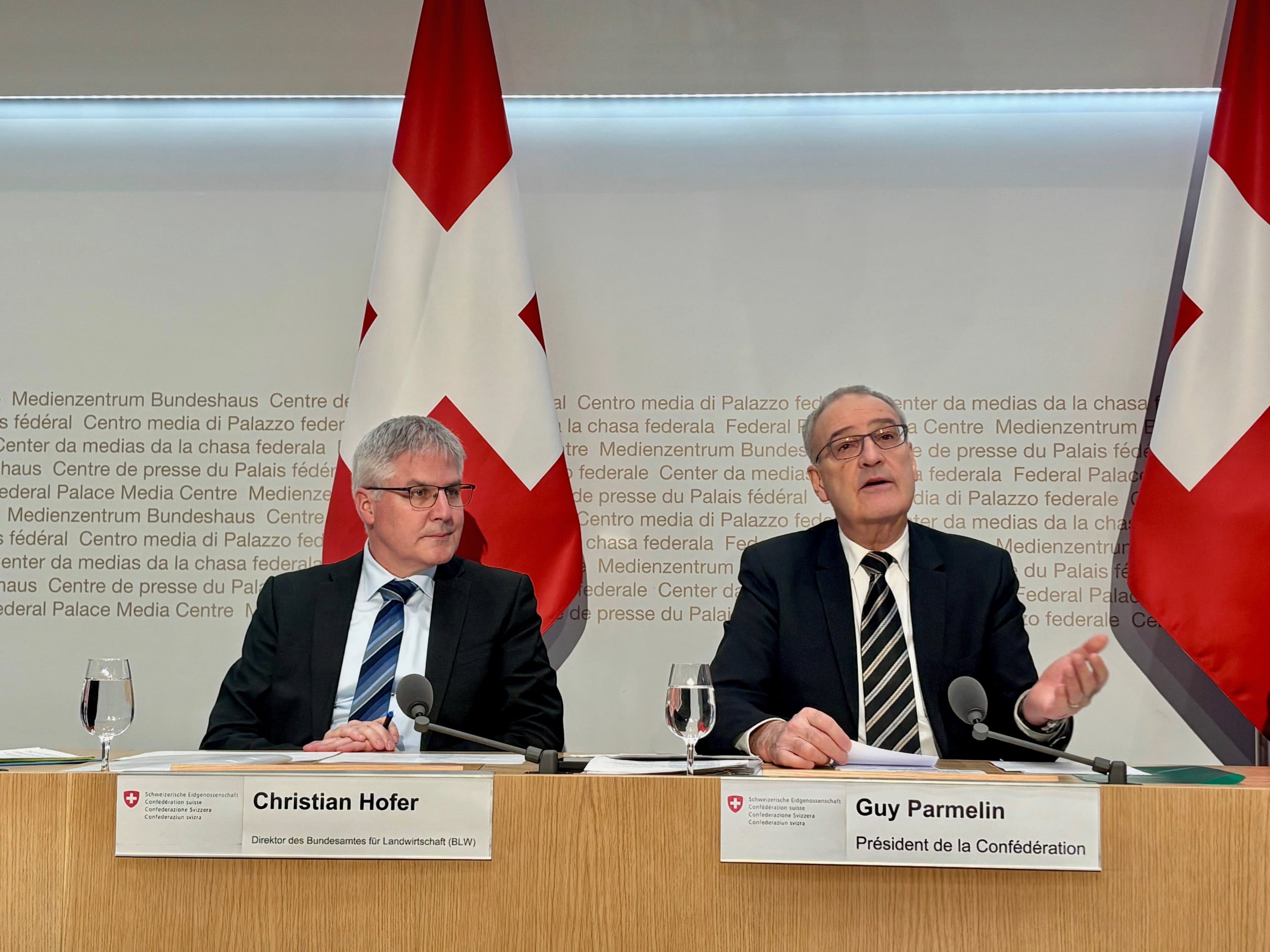 Bundesrat Guy Parmelin spricht sich zur künftigen Agrarpolitik ab 2030 (AP30+) aus. Neben nahm Christian Hofer, Direktor des Bundesamts für Landwirtschaft, an der Pressekonferenz teil.