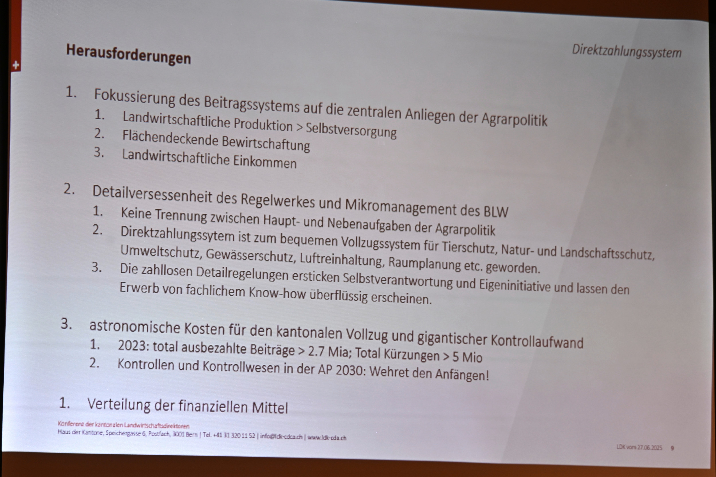 Er kritisierte unter anderem, dass die Erfüllung des Natur- und Heimatschutzgesetzes (NGH) neu wie das Alter des Betriebsleiters von höchstens 65 Jahre eine Voraussetzung werden soll, um überhaupt einen Franken Direktzahlungen beziehen zu können. «Damit werden das Landwirtschaftsgesetz und das Landwirtschaftsgeld zum Naturschutzvollzug umgeleitet. Das geht gar nicht.» Das BLW heisse Bundesamt für Landwirtschaft und nicht anders.