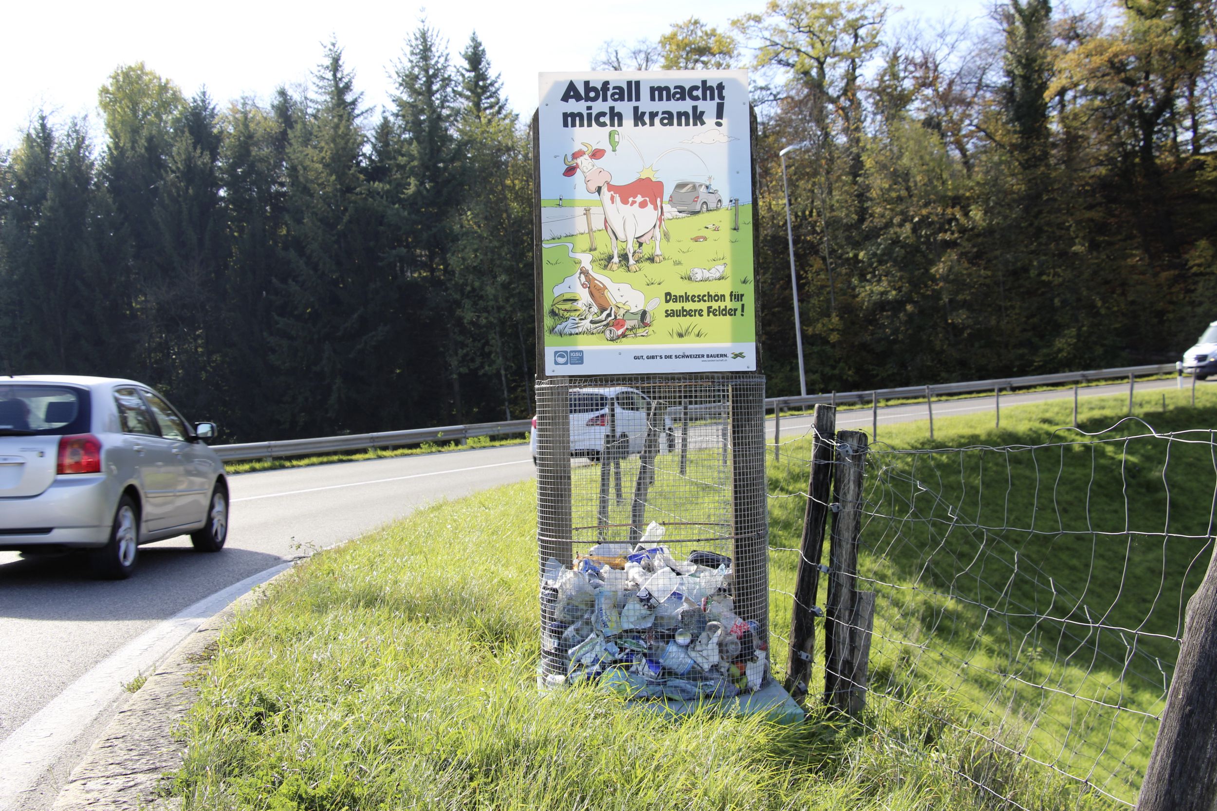 Der Aargauer Bauernverband sensibilisiert seit Jahren die Bevölkerung jedes Jahr mit unterschiedlichen Sujets auf das Problem Litterung. Das Plakat von diesem Jahr setzt bei den messerscharfen Rückständen an. Das Sujet zeigt den Grabstein der Kuh Blüemli, die dem Littering zum Opfer fiel. «Abfall tötet Tiere», lautet die Botschaft des Verbandes. Auf dem Grabstein steht: «Qualvoll gestorben durch Splitter einer Alu-Dose».