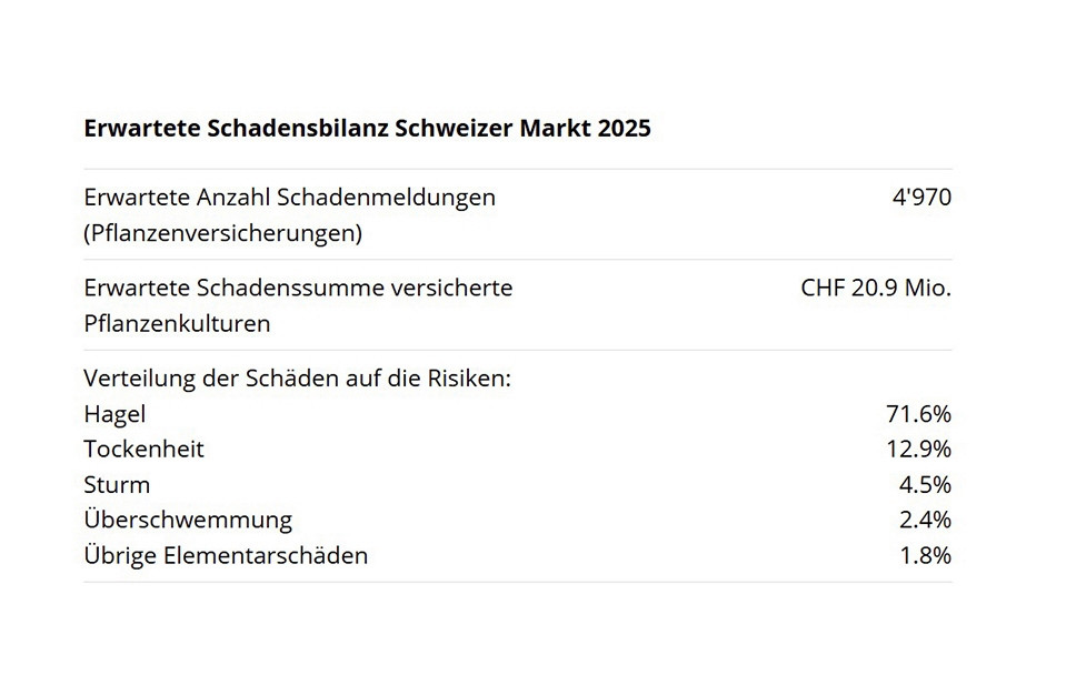 Für das gesamte Jahr 2025 liegt die erwartete Anzahl der Schadensmeldungen knapp unter 5000. Die erwartete Schadenssumme der versicherten Pflanzenkulturen beträgt 20,9 Millionen Franken. Für knapp 72 Prozent der Schäden sei Hagel verantwortlich. Rund 13 Prozent der Schäden wurden durch Trockenheit verursacht. 4,5 Prozent entfallen auf Sturm, 2,4 Prozent auf Überschwemmungen.