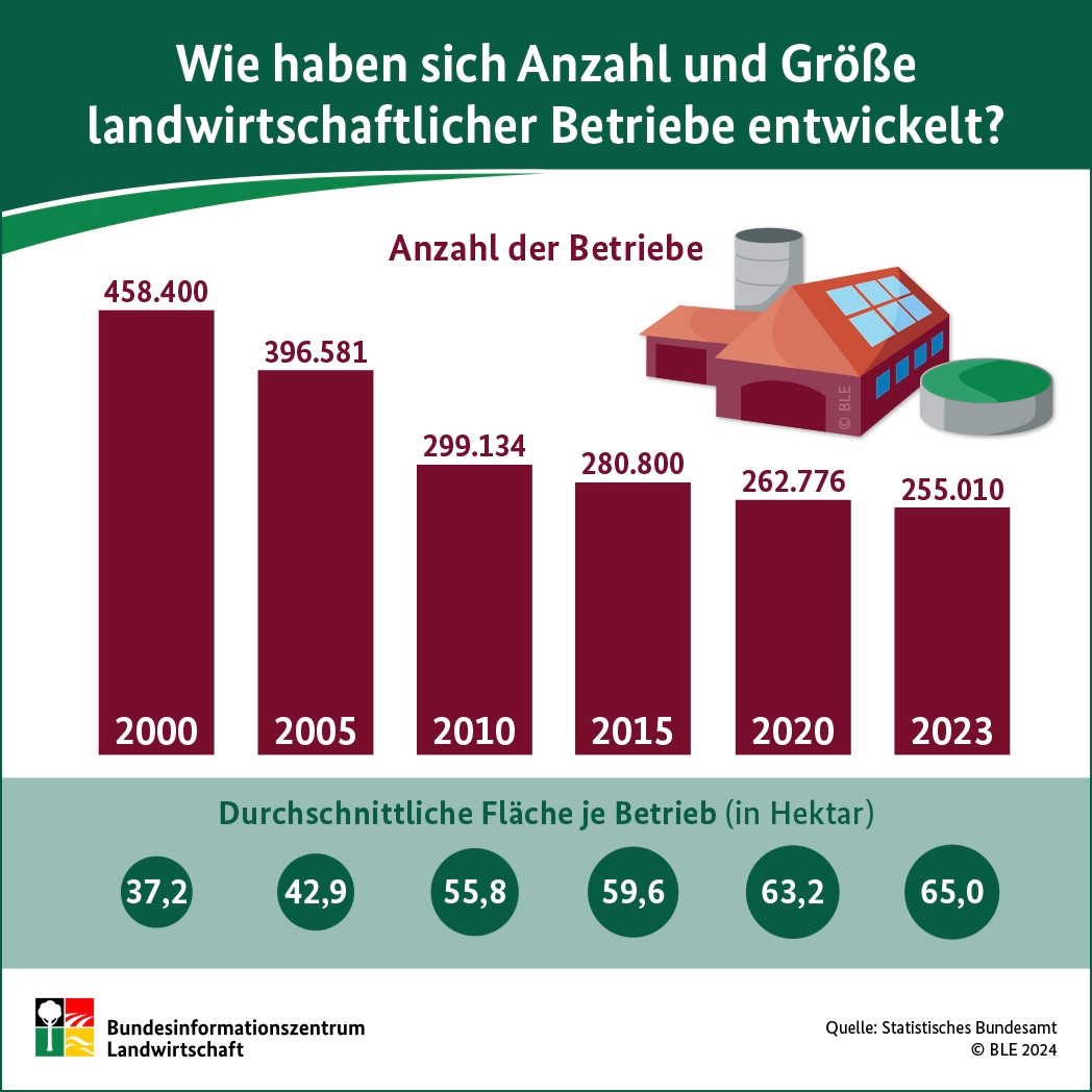 Rund 255’010 landwirtschaftliche Betriebe gab es 2023. Seit der Jahrtausendwende ist die Anzahl landwirtschaftlicher Betriebe damit um fast 45 Prozent gesunken. Seit 2010 hat sich der Strukturwandel in der Landwirtschaft zwar etwas verlangsamt, er schreitet dennoch weiter voran, schreibt das Bundesinformationszentrum Landwirtschaft.