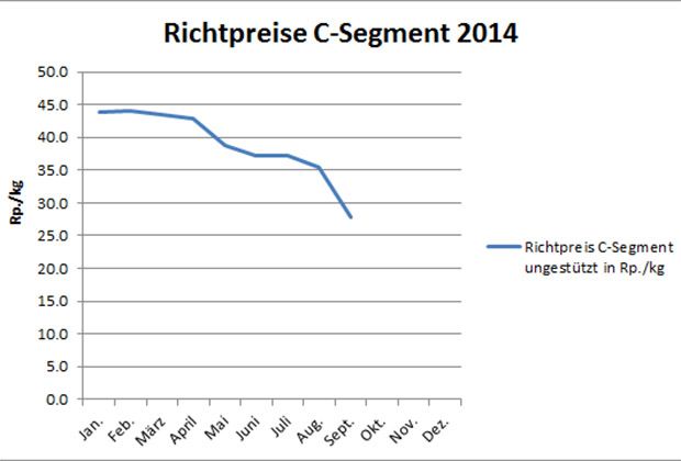 Der Richtpreis für B-Milch ist im September 2014 mit 53 Rp./kg um 5,6 Rappen tiefer und der C-Preis liegt mit 27,9 Rp./kg um 7,5 Rappen tiefer als im August 2014. Das dürfte auch Auswirkungen auf die A-Preise haben, weil die meisten Milchhandelsorganisationen Mischpreise für A- und B-Milch ausbezahlen.