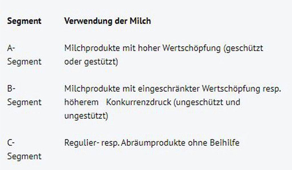 Der Richtpreis für A-Milch wird mithilfe des Molkereimilchpreisindex (BLW) und der prospektiven Markteinschätzung des Vorstandes der BOM quartalsweise festgelegt. Der Richtpreis im B-Segment entspricht dem Rohstoffwert eines Kilogramms Milch bei der Verwertung zu Magermilchpulver für den Weltmarkt und Butter für den Inlandmarkt. Der Richtpreis im C-Segment entspricht dem Rohstoffwert eines Kilogramms Milch bei der Verwertung zu Magermilchpulver und Butter für den Weltmarkt.