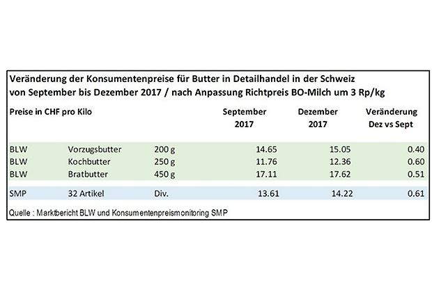 Am 1. Oktober 2017 wurde der Richtpreis für industrielle Molkereimilch um 3 Rappen erhöht. In denselben Umfang stiegen auch die Produzentenpreise. Von den höheren Butterpreisen hätten die Bauern aber nicht profitiert, kritisieren die Schweizer Milchproduzenten (SMP).