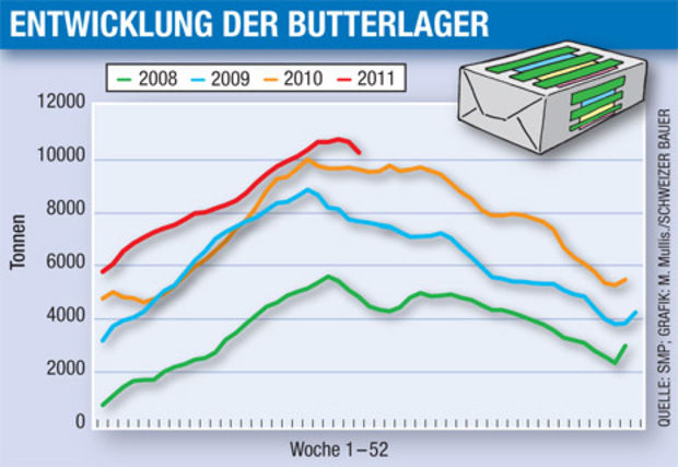 Noch immer sind die Butterlager grösser als 10000 Tonnen, auch wenn sie letzte Woche aus saisonalen Gründen von 10699 Tonnen auf 10298 gesunken sind. Mit 1 Rappen auf den Basismengen 2008/2009 und 4Rappen auf den Mehrmengen wollten die BOM-Delegierten diesen Butterberg zum Schmelzen bringen. Doch der Bundesrat hat auch am Mittwoch an seiner letzten Sitzung vor der Sommerpause noch immer keine Allgemeinverbindlichkeit zur Ausdehnung auf die Nicht-Mitglieder beschlossen.