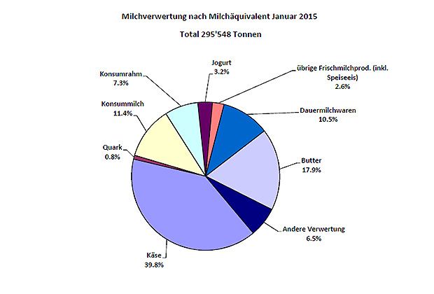 Ob es sich beim Produktionsrückgang im vergangenen Januar um eine Trendwende handelt, werden die folgenden Monate zeigen. Knapp 40 Prozent der Milch (117‘700 Tonnen) wurde zu Käse verarbeitet. Im Vergleich zum Vorjahr sank die Produktion aber um 1,6 Prozent. Für die Butterherstellung wurde am zweitmeisten Milch benötigt. 52‘882 Tonnen oder 17,9 Prozent wurden zu „Anke“. Im Vergleich zum Januar 2014 wurde die Produktion um 8,3 Prozent reduziert. Gerechnet wird in Milchäquivalenten. Ein solcher Äquivalent entspricht den Inhaltsstoffen von Eiweiss und Fett eines Kilogramms Milch (Anteil Eiweiss = 0.45 Äquivalent und Anteil Fett = 0.55 Äquivalent).