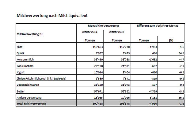 Im Januar 2015 wurde in der Schweiz im Vergleich zum Vorjahresmonat knapp 5000 Tonnen weniger Milch produziert. Dies entspricht einem Rückgang von 1,6 Prozent.