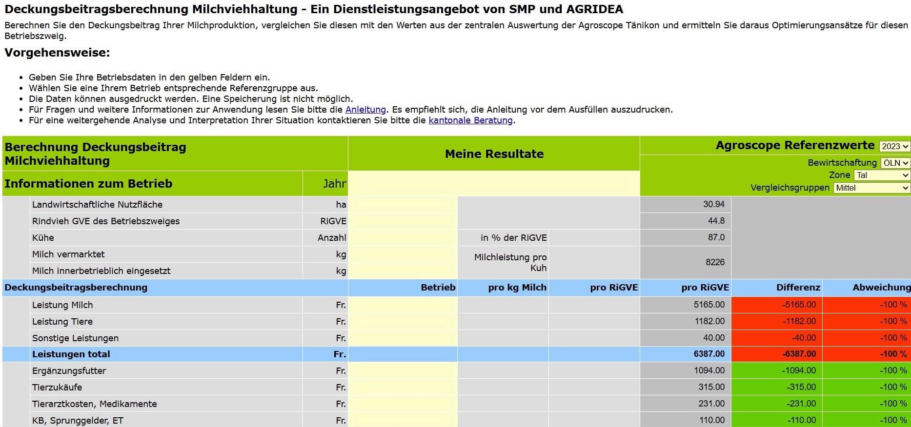 Zunächst werden im Kostenrechner allgemeine Angaben zum Betrieb abgefragt. Anschliessend folgen die Werte für die Ausgaben wie Ergänzungsfutter, Tierzukäufe, Tierarztkosten usw. Danach werden die Erlöse für Milch, Tiere und Sonstiges erfasst. Nun können die Betriebe das aktuelle Vergleichsjahr und die am besten entsprechende Vergleichsgruppe auswählen.