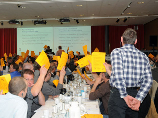 Der Vorstand lehne eine Basisbefragung im Moment ab, sagte SMP-Präsident Peter Gfeller vor den 155 SMP-Delegierten in Bern. Dazu beigetragen habe namentlich die Weigerung des Nationalrates, im Rahmen der Agrarpolitik 2014-2017 (AP 2017) neu auch eine Allgemeinverbindlichkeit auch bei strukturellen Problemen zu erteilen. Zudem habe der Nationalrat auch nichts davon wissen wollen, dass der Bundesrat Selbsthilfemassnahmen zwingend die Allgemeinverbindlichkeit erteilen müsste, wass die Chance für die SMP zusätzlich schmälere, eine Allgemeinverbindlichkeit zu erhalten.