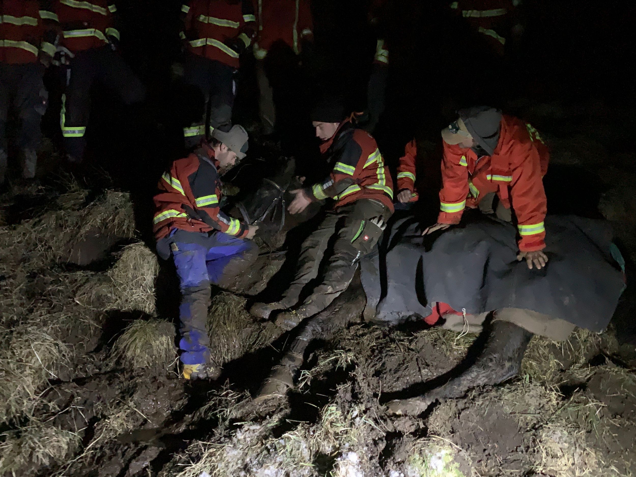 Ein Pferd ist am Freitagabend oberhalb von Därstetten im Kanton Bern im steilen Gelände ausgerutscht und unterhalb des Weges im Morast stecken geblieben. Ein grosses Rettungsteam samt Helikopter konnte das Tier nach einer aufwändigen Aktion befreien.