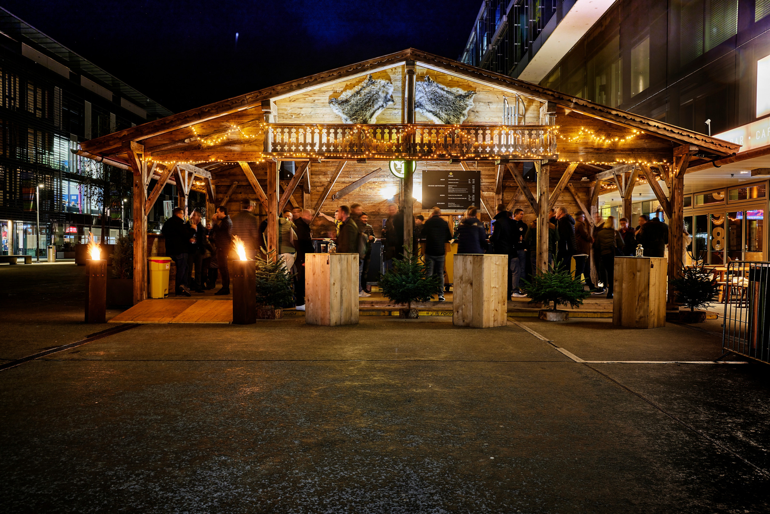 Das hölzerne Chalet bietet den Gästen ein geselliges Wintergefühl vor dem Eingang auf dem Quartierplatz.