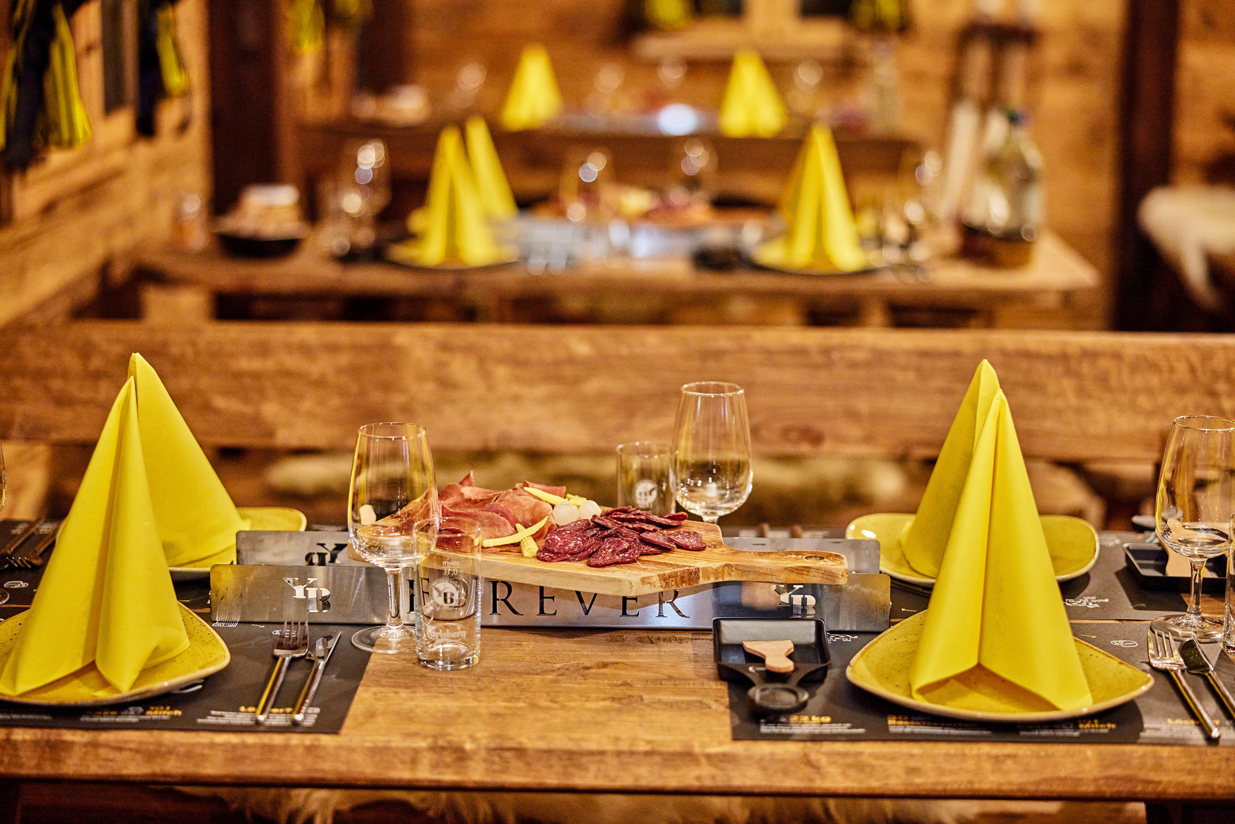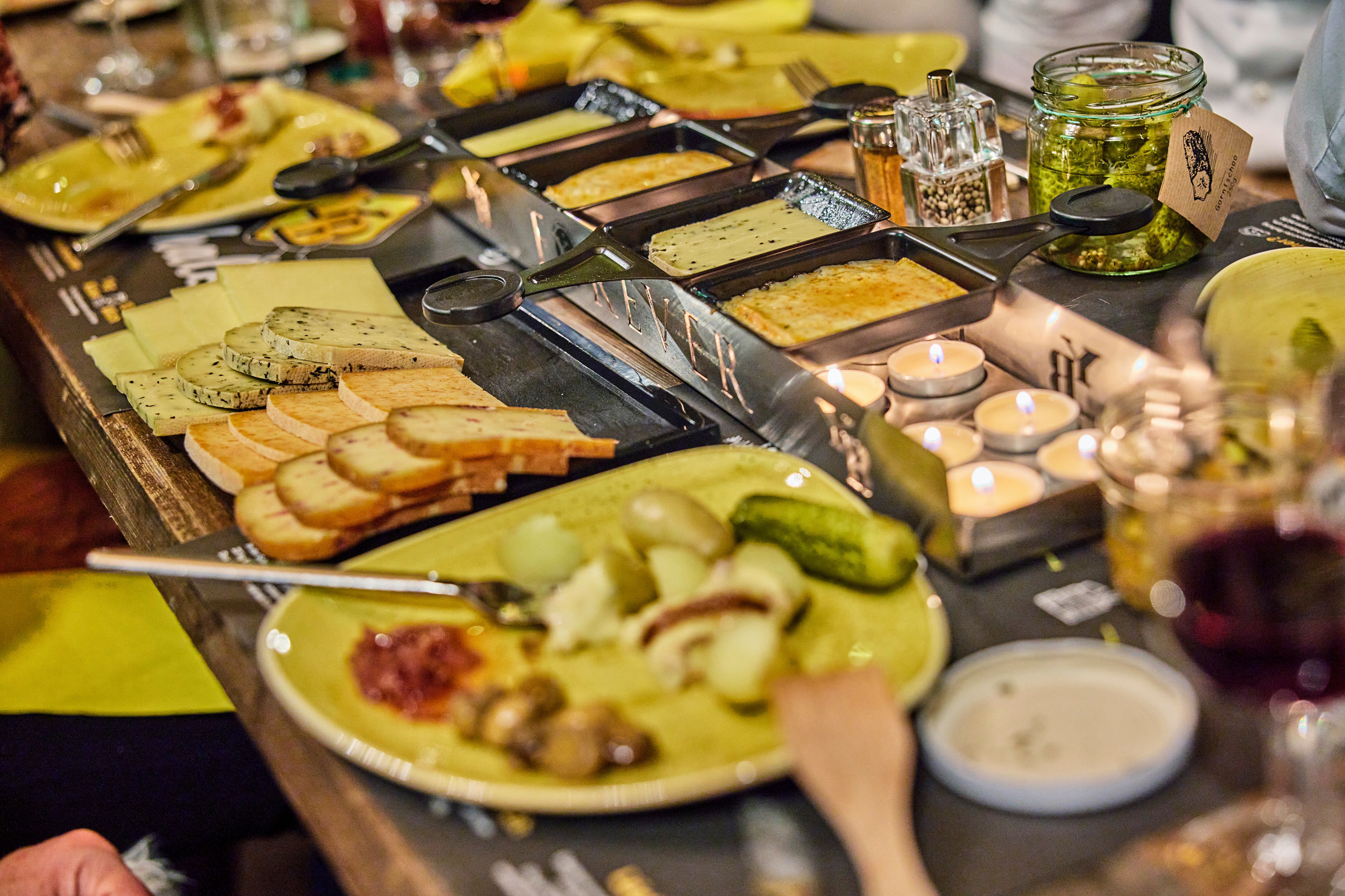 Das Herzstück des Angebots ist das Raclette à discrétion. Gäste brutzeln ihren Käse selbst und können dabei aus mehreren Sorten wählen – neben dem klassischen Raclette kommen Varianten mit Rauchspeck, Safran oder Chili zum Einsatz. Dazu werden Gschwellti, Cornichons, Silberzwiebeln, saisonale Beilagen und nach Wunsch Fleischplatten serviert.
