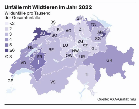 Insgesamt verursachen Unfälle laut watson.ch mit Wildtieren schweizweit Kosten von über 50 Millionen Franken. «Die durchschnittliche Schadensumme beträgt nach einem Unfall rund 3300 Franken. In rund 5 Prozent der Fälle kommt es zu einem Totalschaden», sagt Simone Altwegg von der Axa gegenüber dem Newsportal. Die Zahlen der Wildtiere variieren von Kanton zu Kanton.