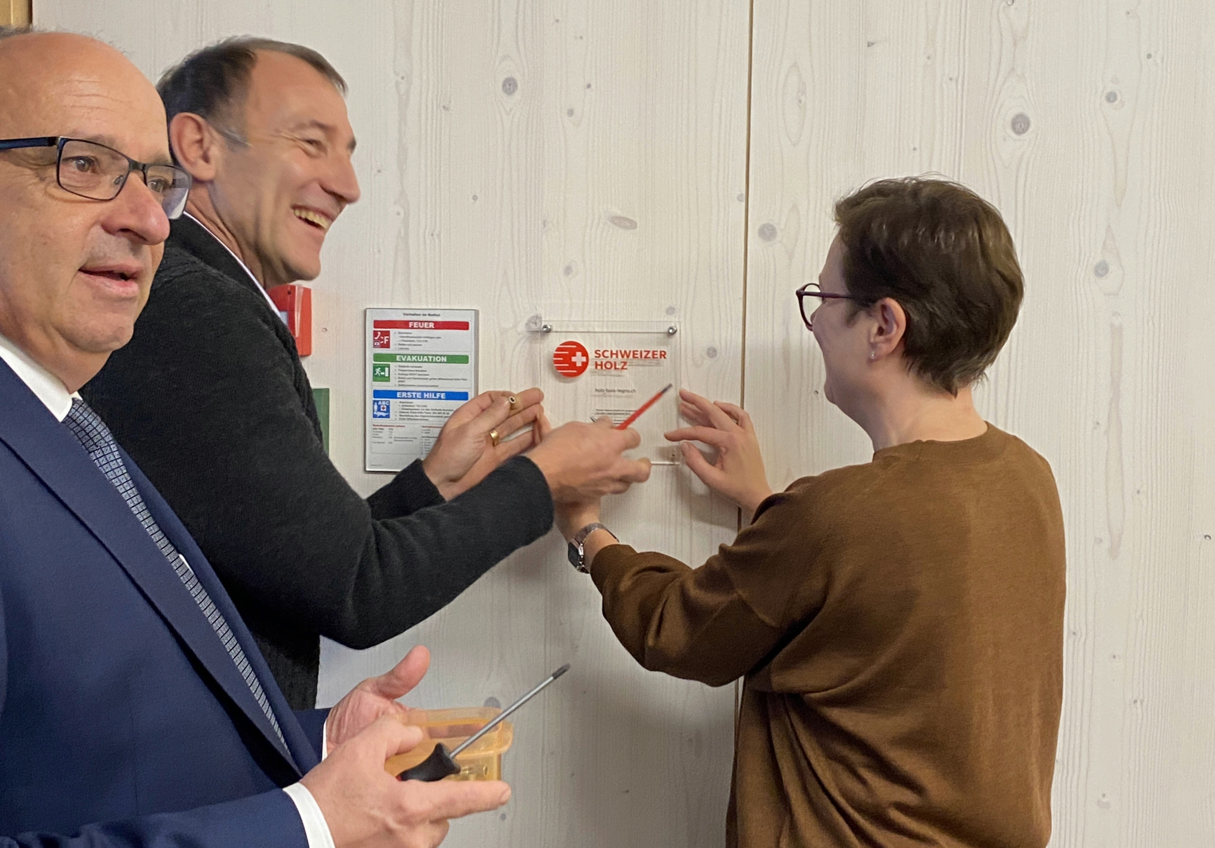 Im kantonalen Amt für Verbraucherschutz brachten Regierungsrat Markus Dieth (l.), Pro-Holz-Präsident Toni Möckel und Alda Breitenmoser, Amtsleiterin eine Tafel fürs «Bauen mit Holz» an.