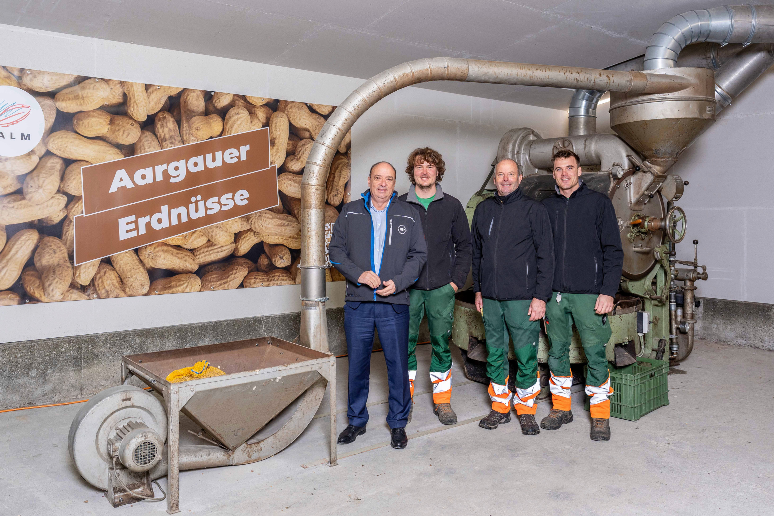 Sie präsentierten die Aargauer Erdnüsse (v.l.): Aargauer Landwirtschaftsdirektor Markus Dieth, Fabian Salm, Hansjörg Salm und Manuel Salm. Im Hintergrund die 100-jährige Kaffeeröstmaschine.
