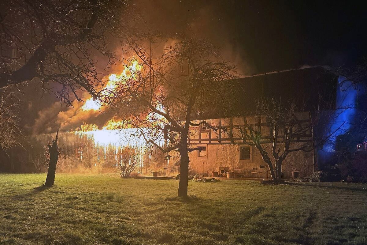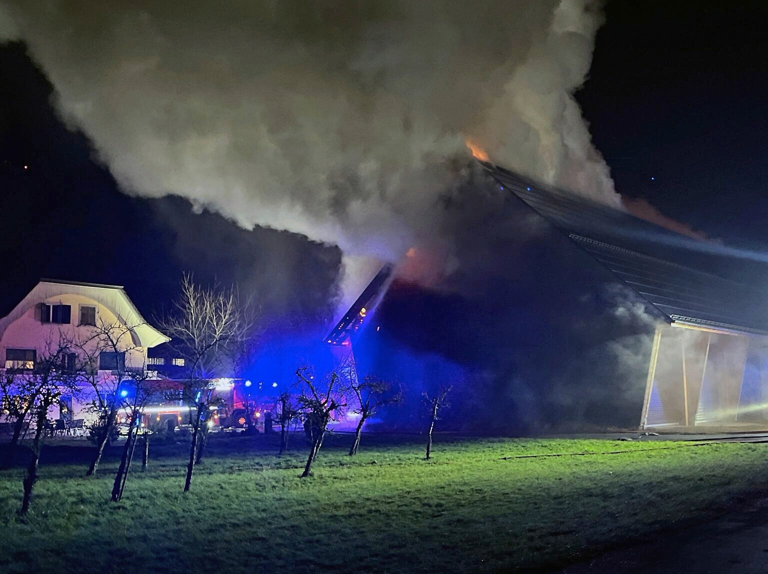 Das Feuer am Donnerstag brach gegen 1.30 Uhr aus. Als die Einsatzkräfte am Brandort am Emmenholzweg eintrafen, stand das längliche Gebäude bereits in Vollbrand. Es wird als Lager, Fahrzeugunterstand und Wohnhaus genutzt.