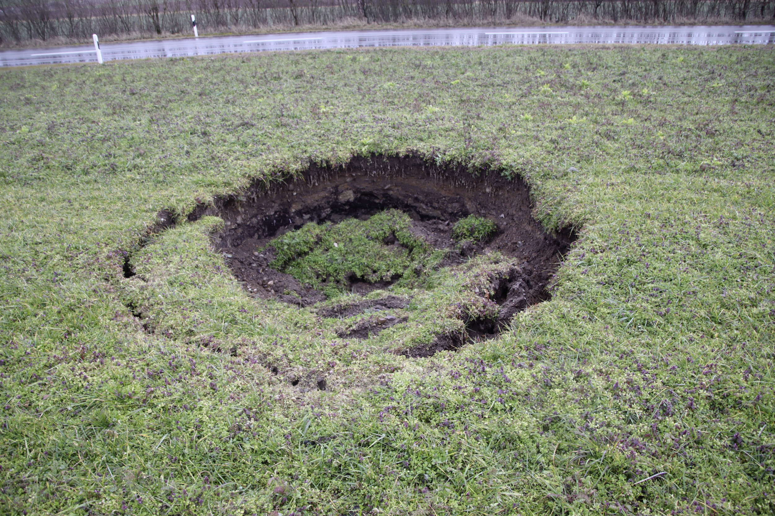 Schon vorher hatte sich eine 40 Aren grosse Fläche um anderthalb Meter gesenkt. Die landwirtschaftliche Nutzung in der Umgebung des Erdlochs ist untersagt, das Gras wird mit einem Roboter gemäht. Abklärungen über die Ursachen und Auffüllungsmöglichkeiten sind im Gang. Im Gebiet wurde bis 1989 ein Gipsbergwerk mit einem 25 km langen Stollensystem betrieben. Die Haftungsund Kostenfrage ist noch offen. Neben den ehemaligen Gipsstollen könnten auch natürliche Karstformationen eine Ursache für die Senkungen sein.