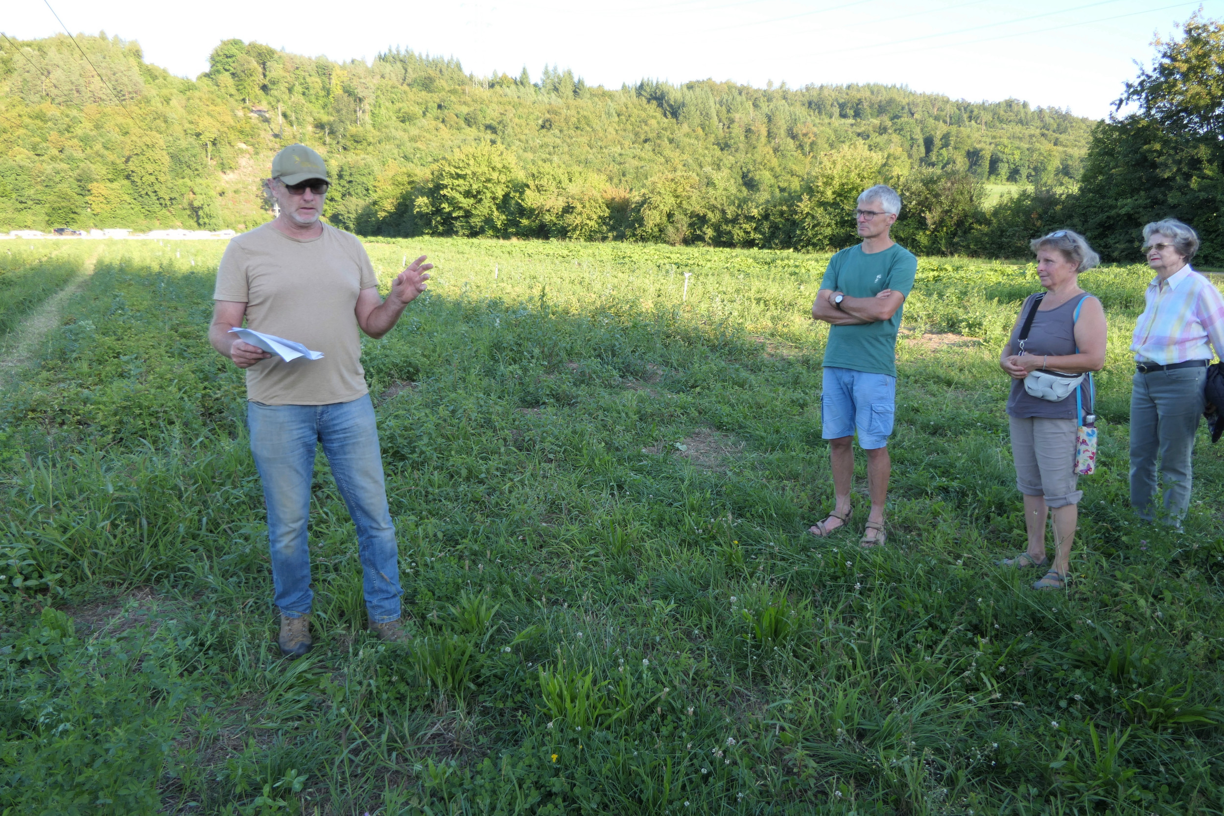 Biobauer Dieter Weber mit Interessierten vor seinem gemulchten Kartoffelacker.
