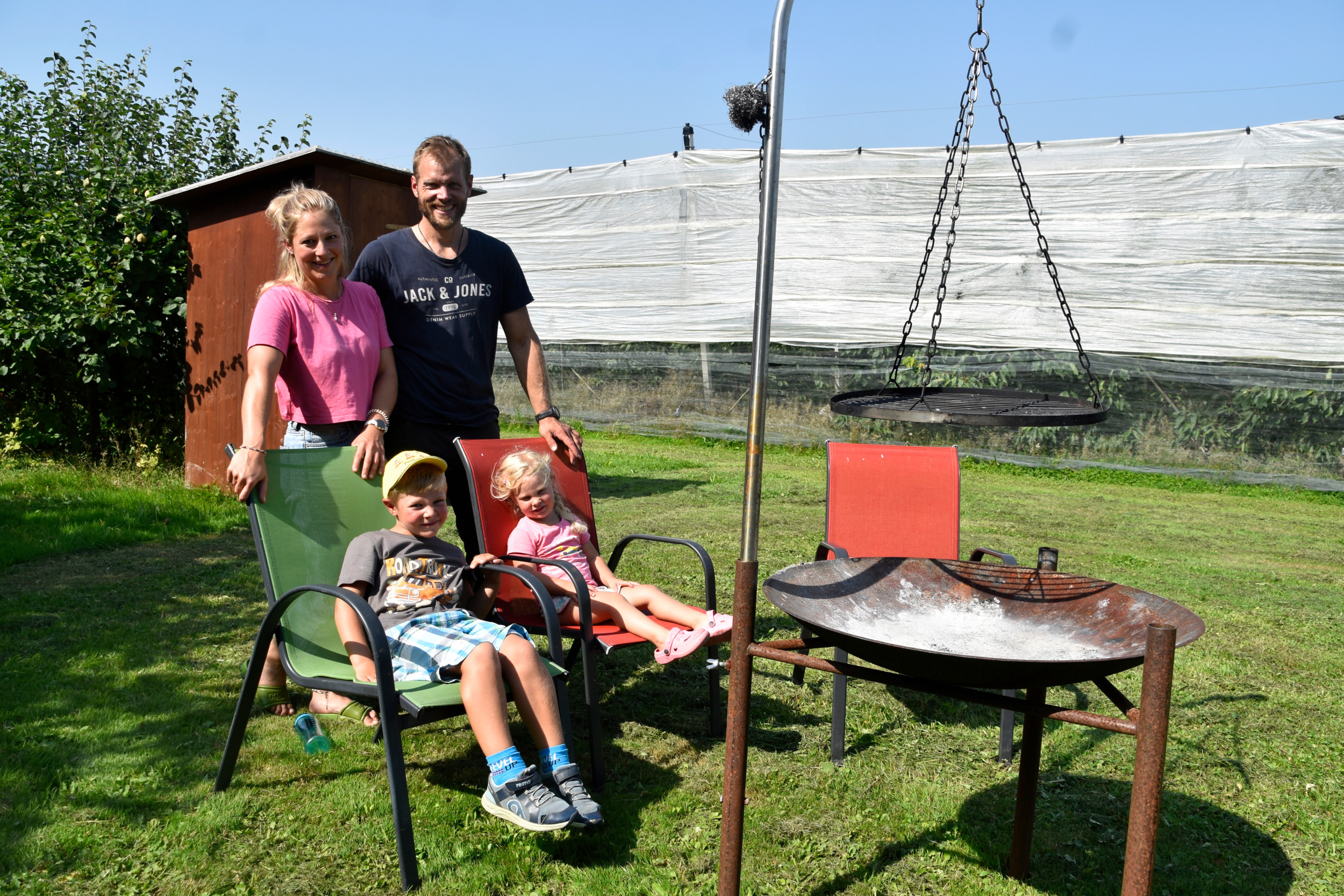 Christian Büttiker und Daria Baumgart mit ihren Kindern: Sie bieten auf ihrem Hof nicht nur einen Stellplatz an, sondern auch eine Feuerschale zum Grillieren.