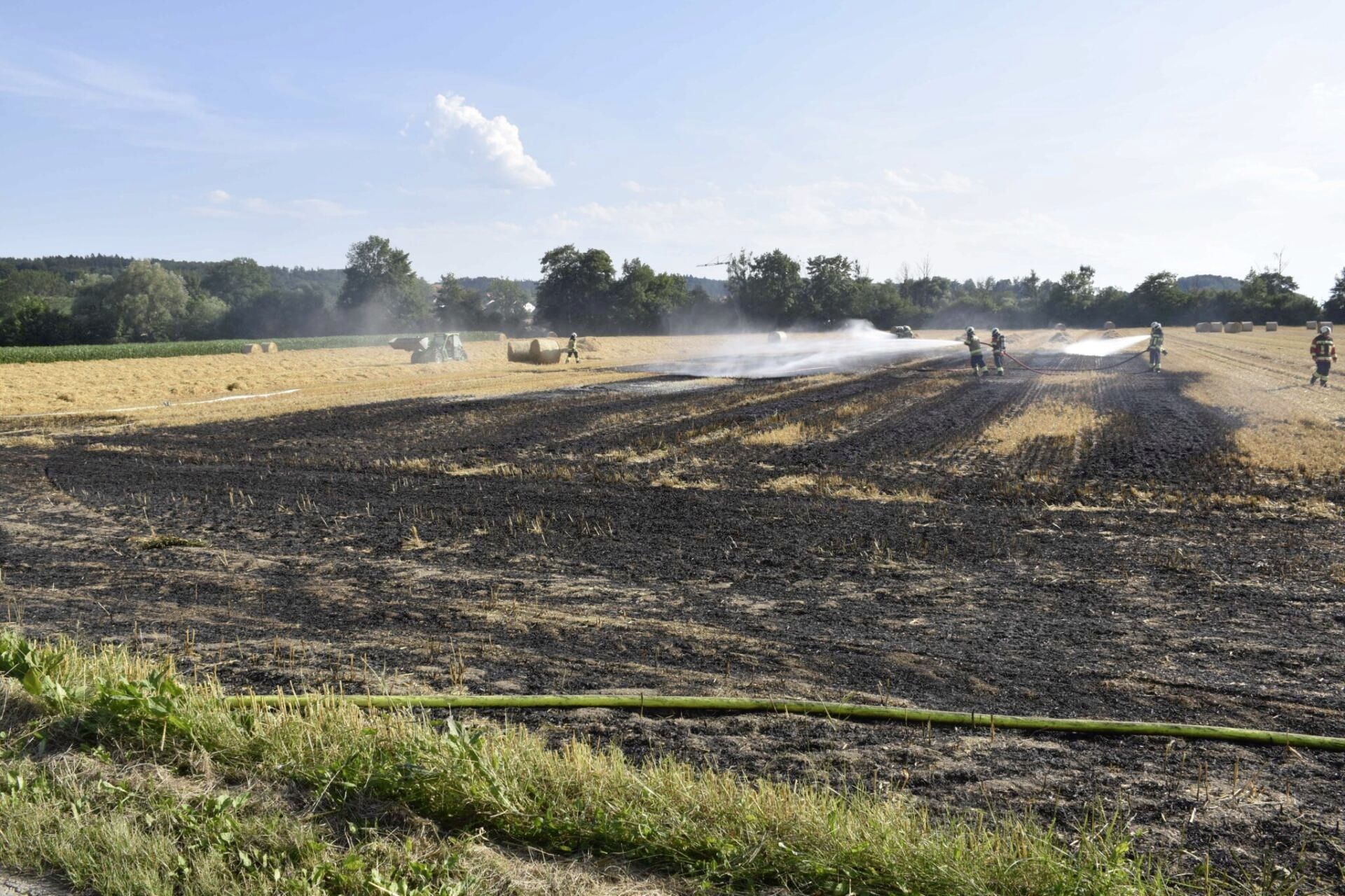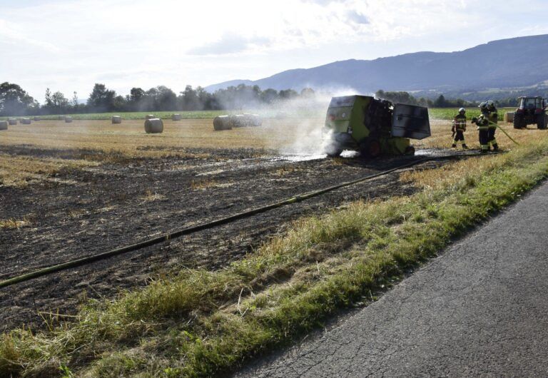 Gegen 18 Uhr geriet die Presse während dem Einsatz aus noch zu klärenden Gründen in Brand. Die Flammen steckten auch das Stoppelfeld in Brand. Diese brannte auf einer Fläche von zirka 50×100 Metern nieder. Das Feuer konnte schliesslich durch die ausgerückte Feuerwehr unter Kontrolle gebracht und gelöscht werden.