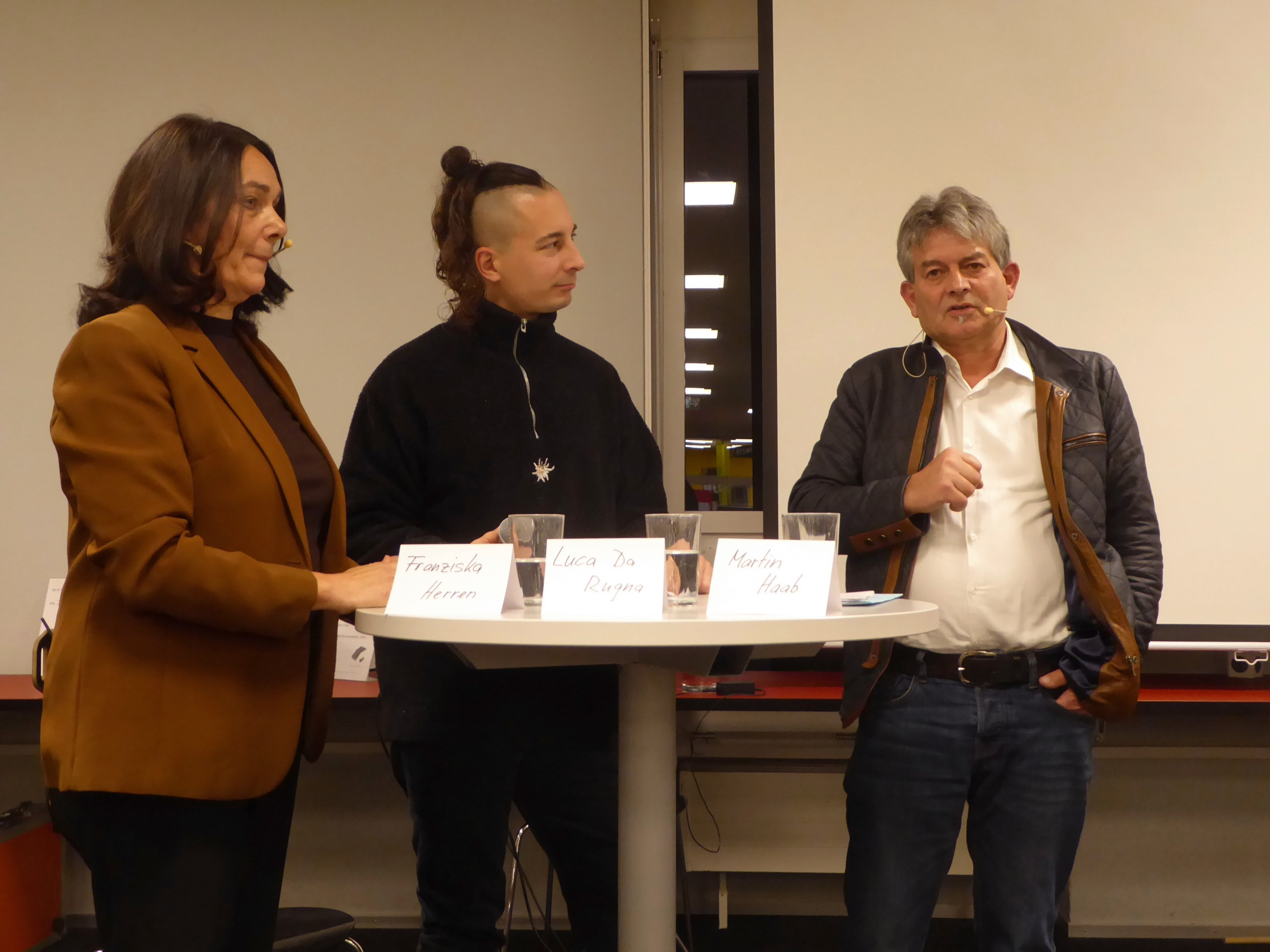 treitgespräch: Franziska Herren, Moderator Luca da Rugna und Martin Haab.