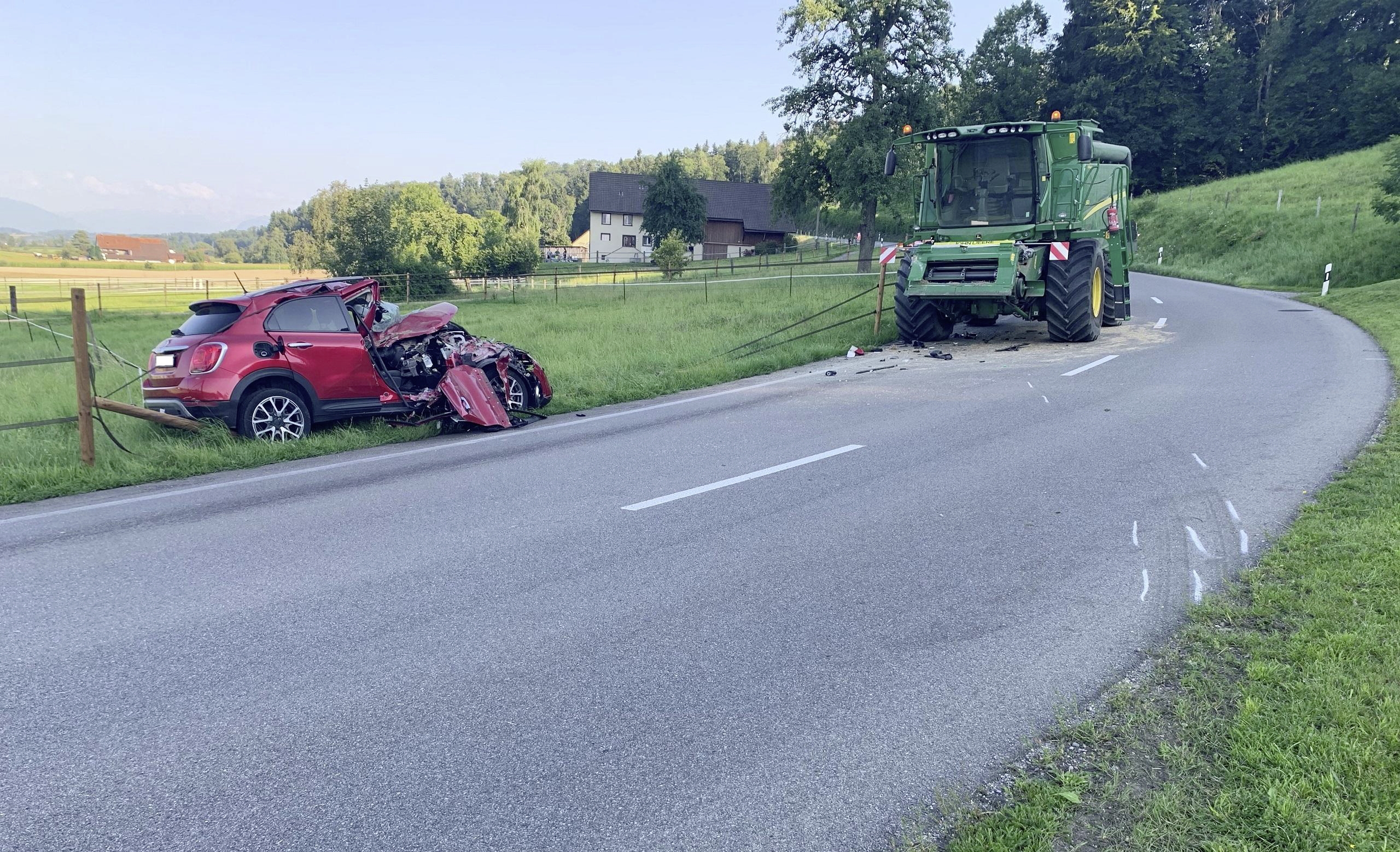 Die Autolenkerin hatte Glück im Unglück. Sie wurde mit leichten Verletzungen ins Spital gefahren. Am Mähdrescher, an einem Zaun und an der Strasseneinrichtung entstand ein Sachschaden von mehreren Tausend Franken. Wegen dem Unfall wurde die Strasse für rund zwei Stunden gesperrt.