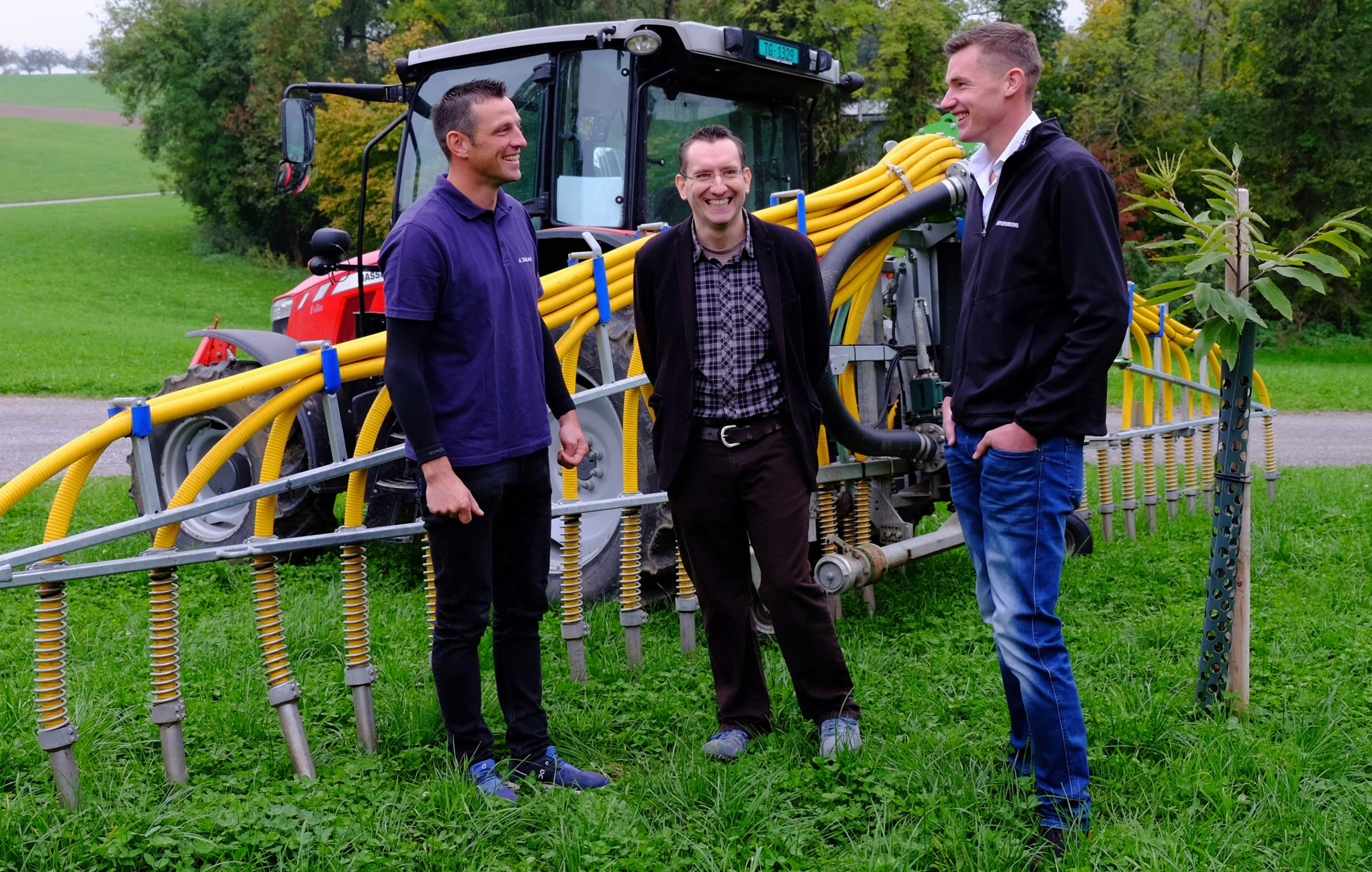 Sie präsentierten den Massnahmenplan Ammoniak und dessen Umsetzung: Landwirt Felix Würth, Sebastian Menzel vom Amt für Landwirtschaft und Kilian Appert vom Arenenberg (v. l.).